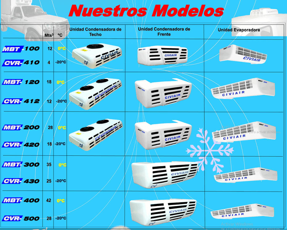 Equipo diseñado para cajas térmicas de hasta 45 m3. con una aislacion de 2 pulgadas de poliuretano expandido rindiendo una temperatura de 0ºC. Sistema compuesto por un compresor, accionado por la correa del vehículo, una unidad condensadora en el frente del vehículo (sobre cabina) compuesta por: filtro deshidratador visor de liquido tubo recibidor condensador tubo de cobre y aleta de aluminio, Ideal para camiones tipo Mercedes Benz 2426 , VW 17-190 ó similar que transportan sustancias refrigeradas.